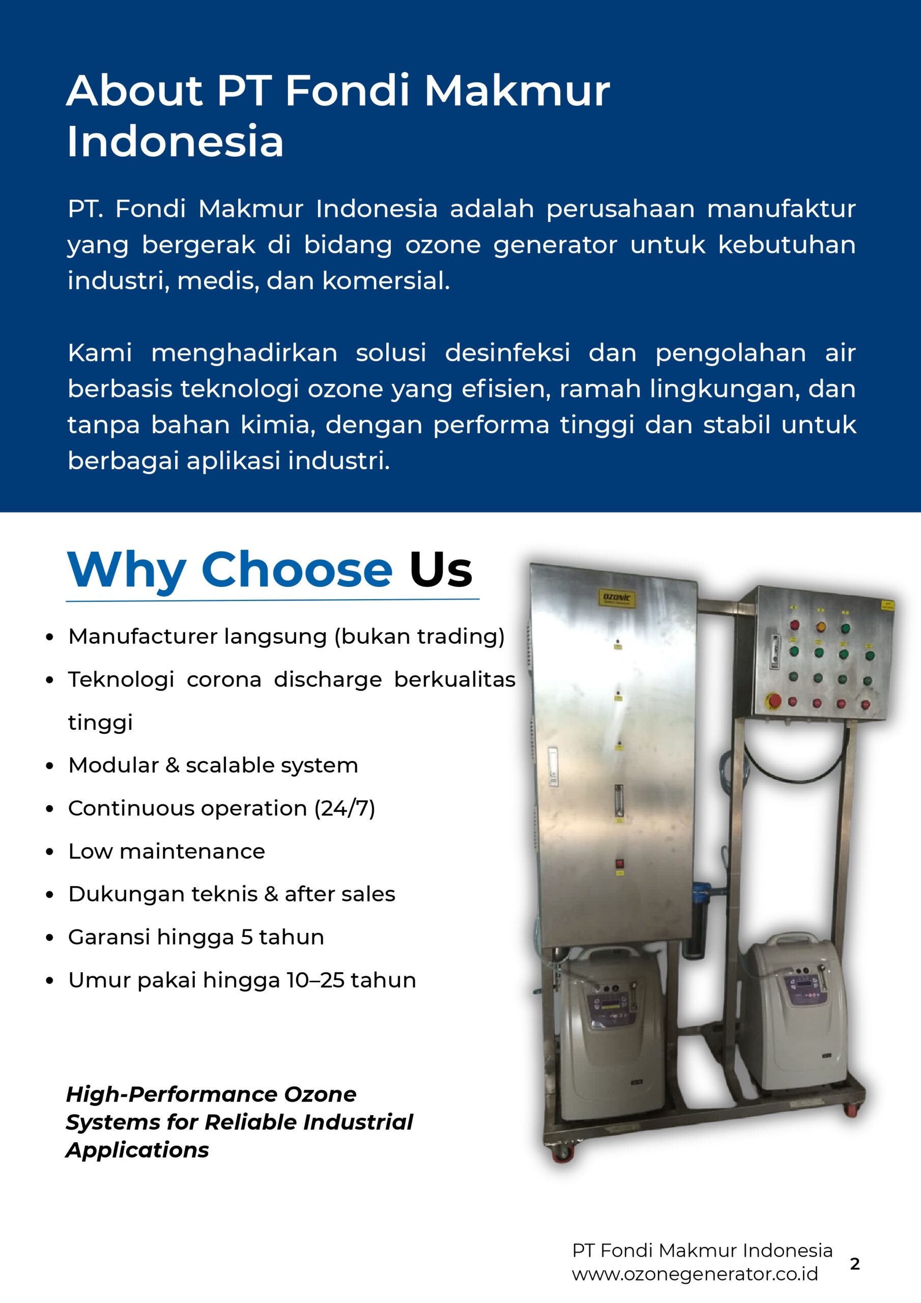 Produk unggulan kami yaitu Ozonic Ozone Generator dimana produk yang satu ini memiliki teknologi dari Germany dan dirakit di Indonesia sehingga kualitas terjamin dengan harga yang murah. PT. Fondi Makmur Indonesia ini telah berpengalaman lama dan di kelola oleh tenaga ahli yang memiliki latar belakang baik. Hubungi kami sekarang juga !