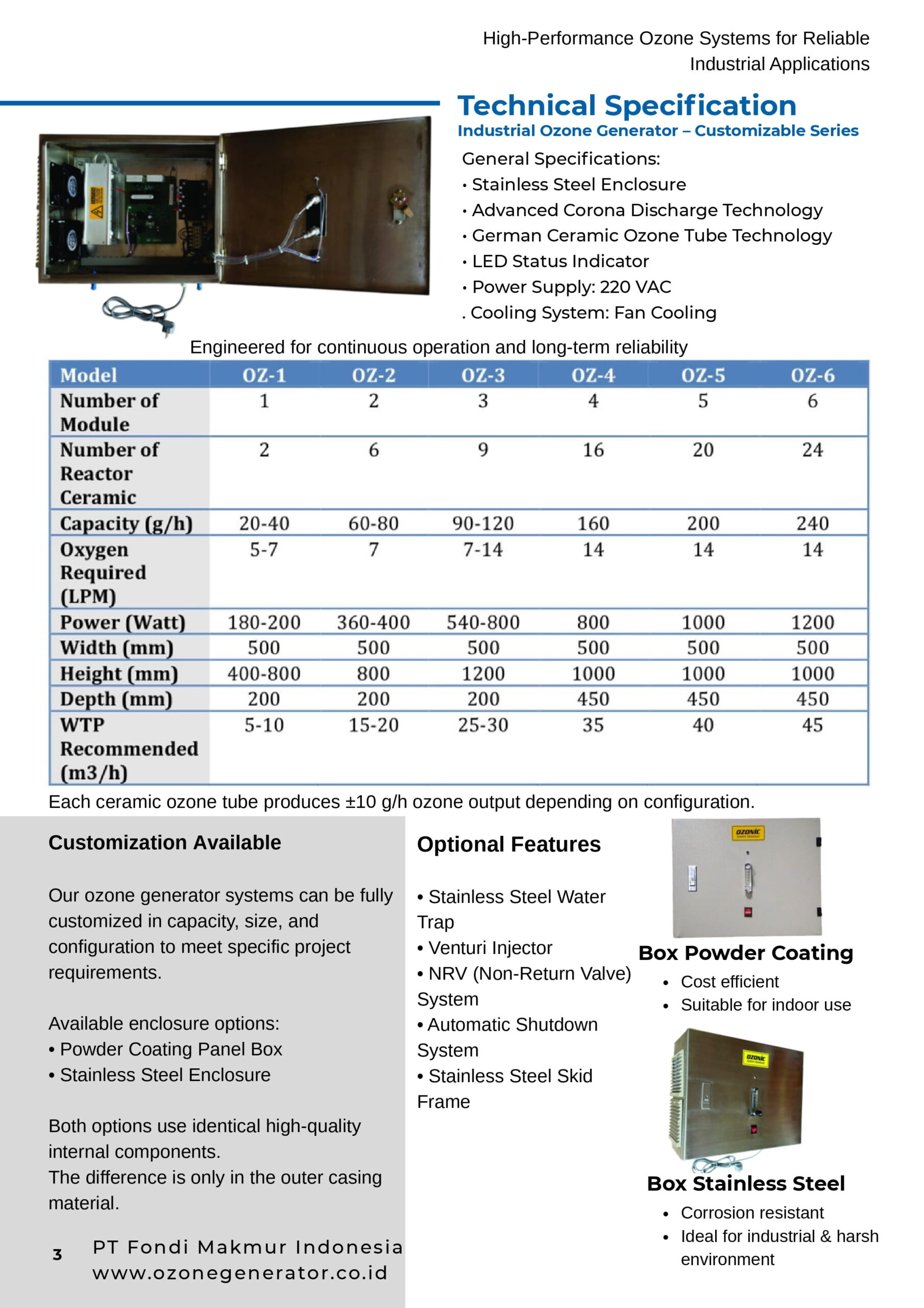 | Kapasitas Ozone | Box Powder Coating (Besi lapis, ekonomis) |